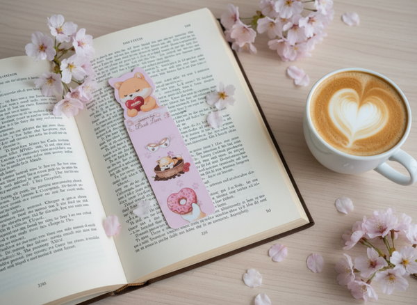 Dieses liebevoll gestaltete Lesezeichen bringt Gemütlichkeit in jede Lesepause. Das zarte, rosafarbene Design zeigt einen niedlichen Shiba Inu im Café-Stil mit süßen Details wie Pancakes, Herzchen und einer kleinen Kaffeetasse – perfekt für alle, die kawaii Motive und entspannte Lesemomente lieben.